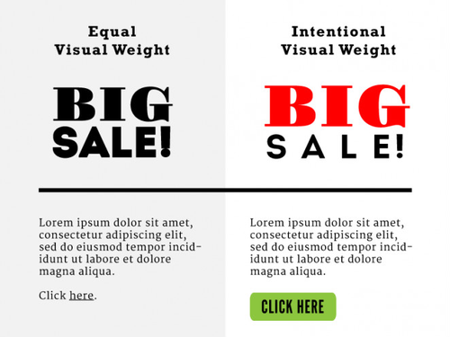 在比例和尺寸相同的情況下,利用視覺重量(英: Visual Weight)【http://uec.nq.com/works/176】就可以將設(shè)計(jì)中重要的部分給凸顯出來了。在視覺重量中,將那個(gè)元素與剩余的元素進(jìn)行顯著的區(qū)分,這種方法我們稱之為高對(duì)比度(英: High-Contrast)。被視覺重量所采用的設(shè)計(jì)要素,沒有必要是最大的。此外,通過使用紋理。配色和圖形等,給他一種【重(英: Weighty)】的印象,也能做出有魅力的設(shè)計(jì)。