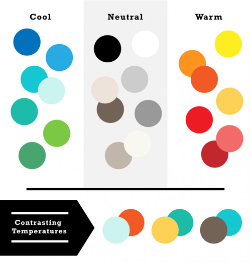 所有的顏色都是有溫度的,他可以被分為暖色(英: Warm)、冷色(英: Cool)或者中性色(英: Neutral)。紅色、橙色或者黃色會(huì)給人溫暖的感覺,而藍(lán)色、綠色則會(huì)給人冷的感覺,黑和白就給人中性的感覺(還有些不常見的米色和茶色,也歸屬這一類。),顏色就按這樣來進(jìn)行劃分。利用顏色的溫度的不同來進(jìn)行配色,例如暖色和冷色進(jìn)行組合,可以給人一種巨大的反差。