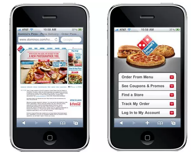 相比在移動(dòng)端上直接操作桌面版網(wǎng)頁,經(jīng)過適配的移動(dòng)網(wǎng)頁會(huì)大大方便用戶的操作使用。舉個(gè)例子,下圖是手機(jī)端 Domino 披薩官網(wǎng)的兩個(gè)版本,一個(gè)是桌面版網(wǎng)頁,另一個(gè)是已適配手機(jī)端的網(wǎng)頁。