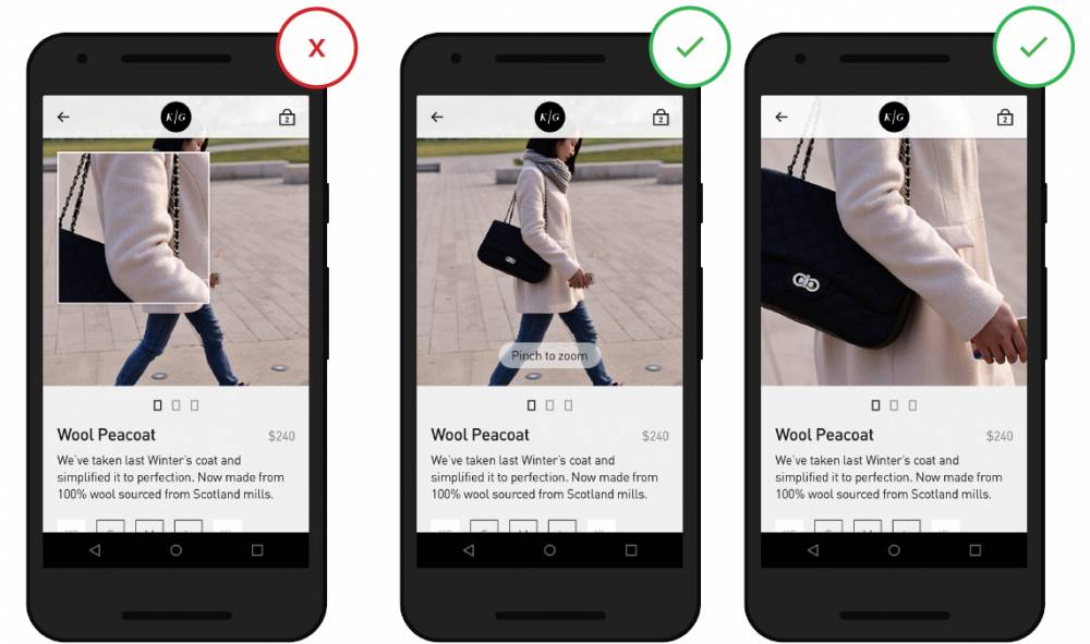 用戶要可通過雙擊圖片或點(diǎn)擊圖片變焦按鈕,輕松地放大商品照片來查看更多的細(xì)節(jié)。此外,圖片放大的部分也應(yīng)該是高分辨率的。