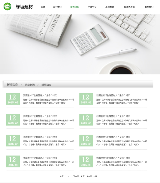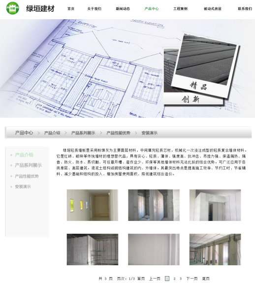 綠垣建材網(wǎng)站欄目設(shè)置: 首頁(yè) 關(guān)于我們 新聞動(dòng)態(tài) 產(chǎn)品中心 案例展示 集成化房屋 聯(lián)系我們