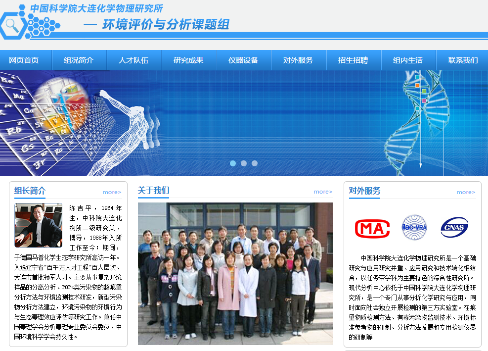 中國(guó)科學(xué)院大連化學(xué)物理研究所環(huán)境評(píng)價(jià)與分析研究組(103組)是一個(gè)集基礎(chǔ)研究、儀器研發(fā)及對(duì)外服務(wù)于一體的綜合科研平臺(tái),位于大連化學(xué)物理研究所生物技術(shù)樓(26#樓),現(xiàn)有研究員4人,副研究員13人,助理研究員2人,其它工作人員10余人,在讀研究生20人,已經(jīng)形成一支包括多層次研究的科研隊(duì)伍和檢測(cè)服務(wù)團(tuán)隊(duì)。
