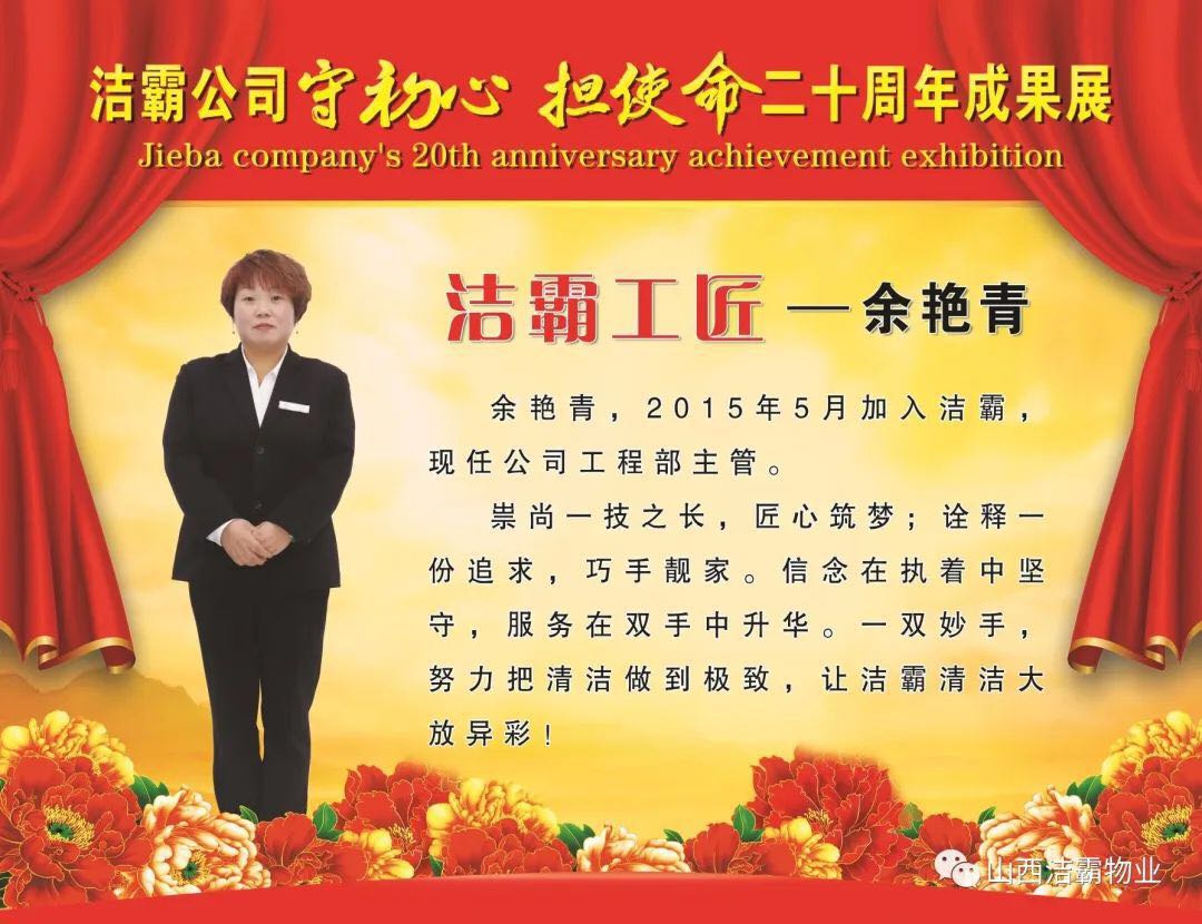 余艷青同志自2015年進(jìn)入潔霸以來,一直奮斗在工程部的第一線從事主管工作。工作中,余艷青同志愛崗敬業(yè),遵守職業(yè)道德,為人誠實(shí)守信;她熱愛工作,對待客戶熱情周到、耐心細(xì)致;工作中團(tuán)結(jié)同事,責(zé)任心強(qiáng),吃苦耐勞,服從大局,以公司的利益為重。在我市開展的“三洗六見一紅旗”活動(dòng)和全國文明城市的創(chuàng)建活動(dòng)中,她帶領(lǐng)員工高標(biāo)準(zhǔn)、高質(zhì)量、高效率地完成清洗美化工作,為扮靚晉城形象,打造城市優(yōu)美環(huán)境做出了突出貢獻(xiàn)。先后多次被公司評為優(yōu)秀員工等,2019年在公司成立20周年慶之際,她又被公司授予“潔霸工匠”稱號(hào)。