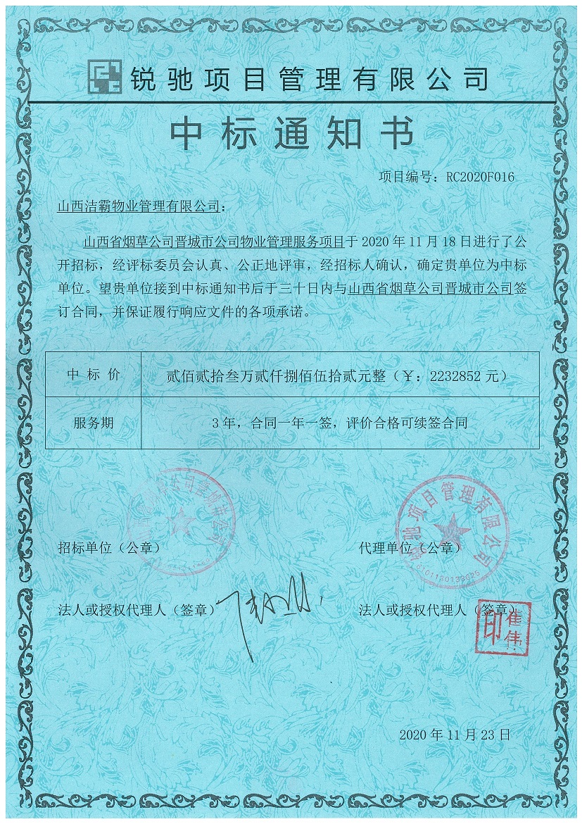 2020年11月18日,山西省煙草公司晉城公司物業(yè)管理服務(wù)項目開標會議在晉城市文昌東街1560號南環(huán)供電營業(yè)站一樓東會議室舉行。在經(jīng)過幾個小時的激烈競標過程評選后,從開標室傳出喜訊,山西潔霸物業(yè)管理有限公司成功中標。中標金額為2232852元,合同期一年。此次中標為潔霸物業(yè)今年的業(yè)績再添一筆輝煌。