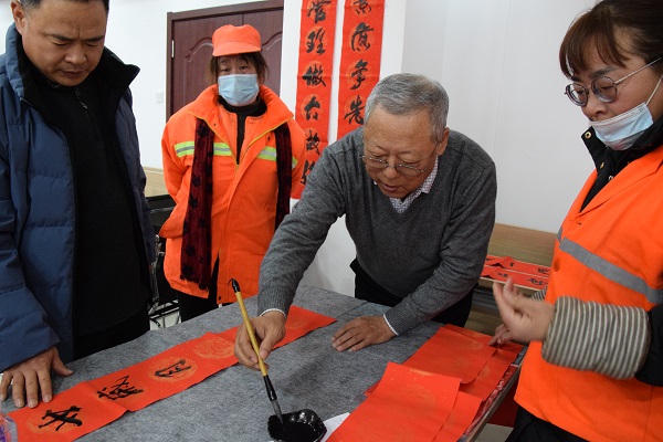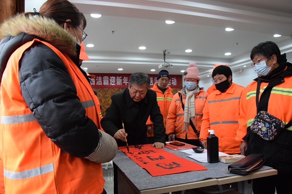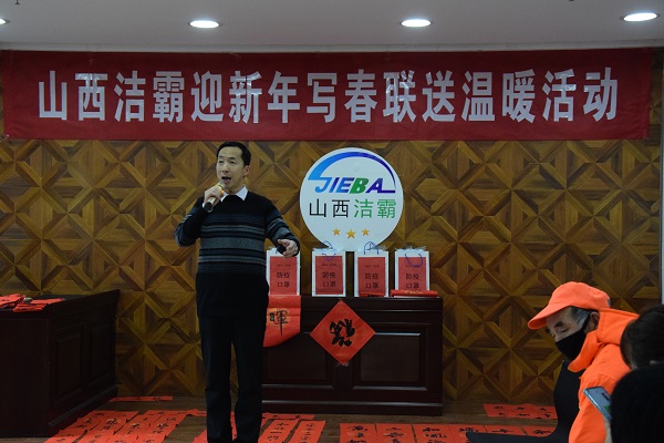 現(xiàn)場(chǎng)人頭攢動(dòng),熱鬧非凡,處處洋溢著歡樂喜慶的氣氛。賈大一老師剛執(zhí)墨筆,就吸引了現(xiàn)場(chǎng)數(shù)十名員工駐足觀賞。他的書法如行云流水,一副寓意著對(duì)新年美好祝福的春聯(lián)便一氣呵成。各位老師揮毫潑墨,一幅幅散發(fā)著清新墨香的春聯(lián)展現(xiàn)在大家面前。“梅花獎(jiǎng)”獲得者張保平老師現(xiàn)場(chǎng)演唱上黨梆子戲曲名段,字正腔圓,渾厚豪邁,把活動(dòng)推向了高潮。市總工會(huì)副主席韓敦峰為員工分發(fā)了對(duì)聯(lián)和防疫口罩。