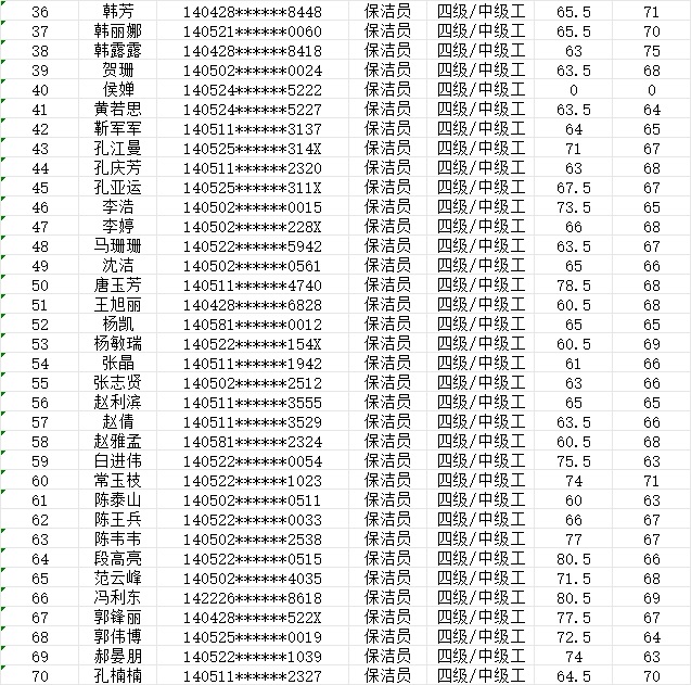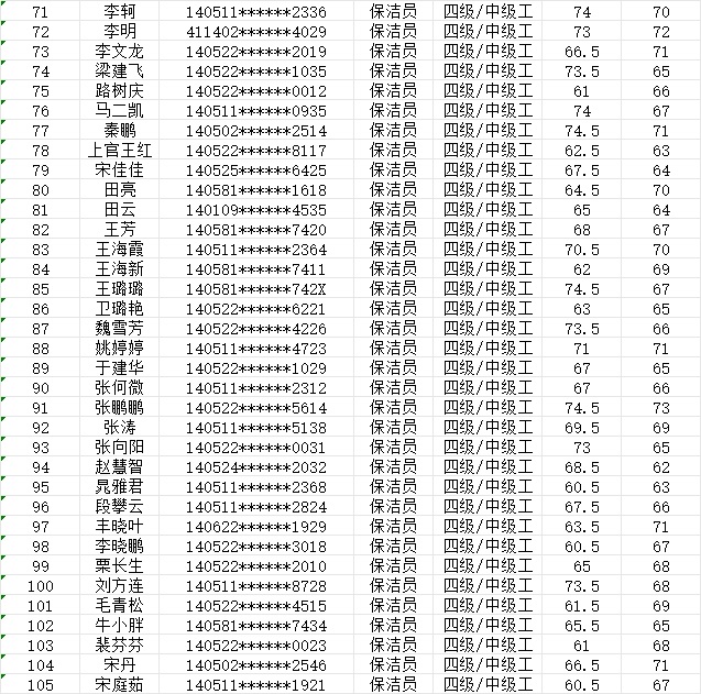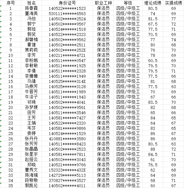晉城市潔霸清潔服務(wù)股份有限公司職業(yè)技能等級(jí)認(rèn)定中心2024年1月20日第2批保潔員中級(jí)認(rèn)定人員成績公示