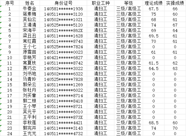 晉城市潔霸清潔服務(wù)股份有限公司職業(yè)技能等級認(rèn)定中心現(xiàn)將2024年6月30日認(rèn)定人員成績公示如下: