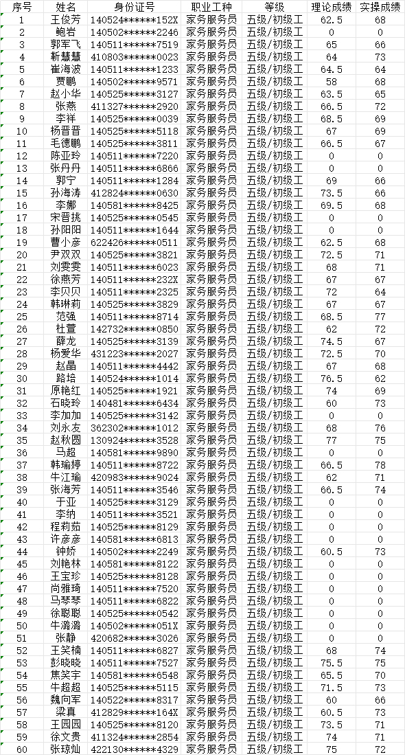 晉城市潔霸清潔服務股份有限公司職業(yè)技能等級認定中心現(xiàn)將2024年7月7日認定人員成績公示如下: