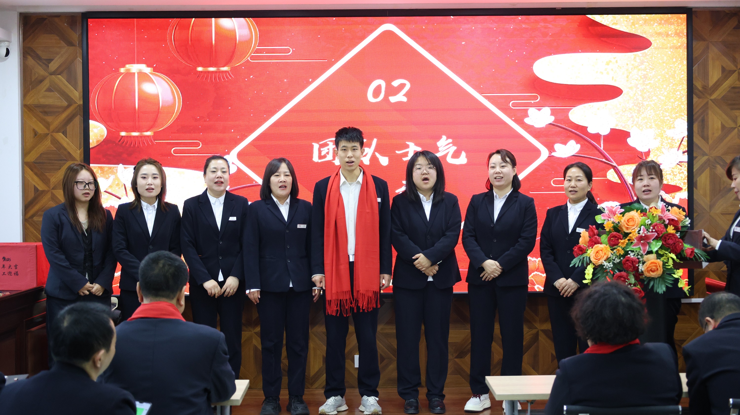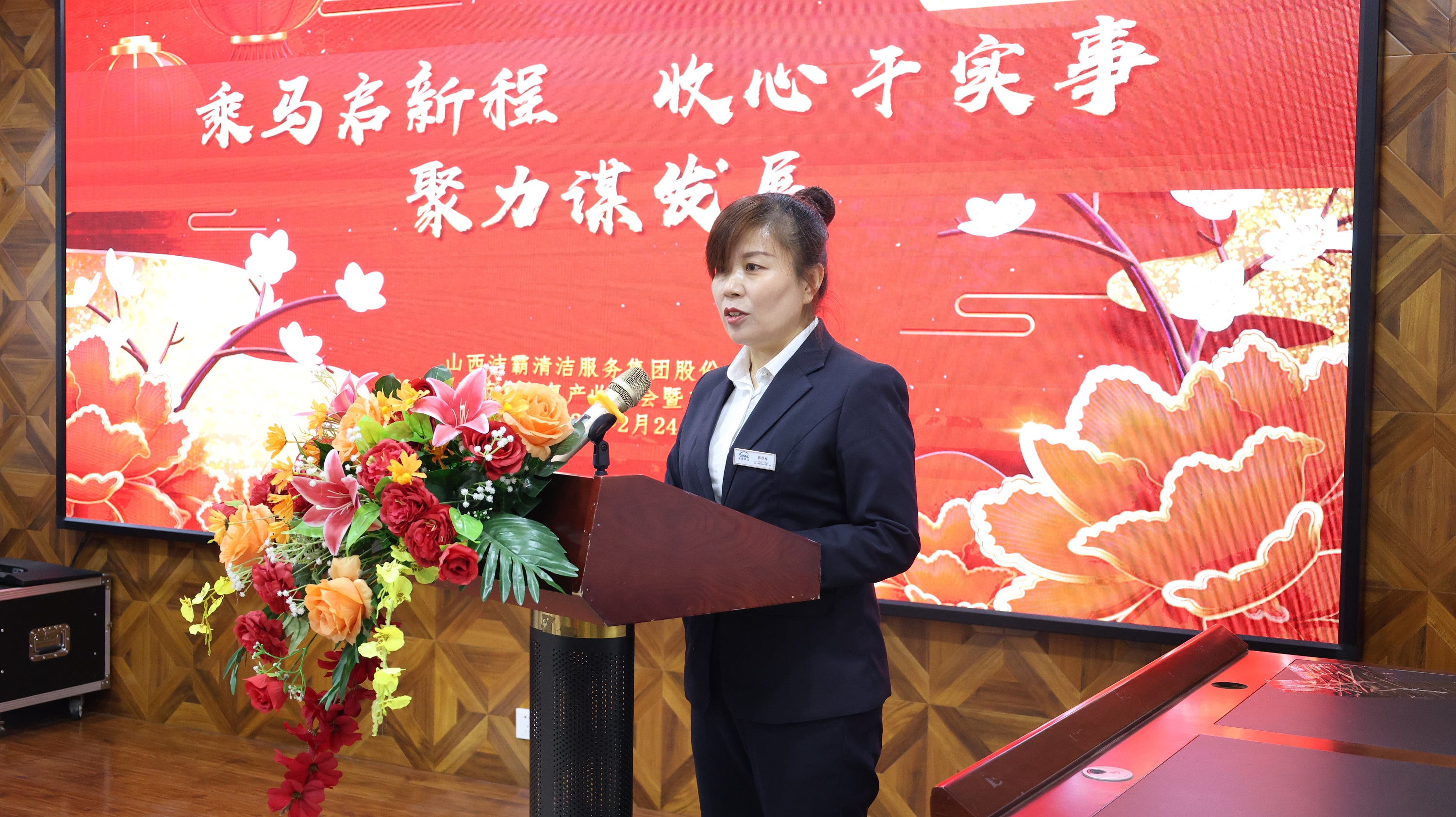 會議召開前,山西潔霸物業(yè)、合眾力勞務派遣、辦公室、保潔部、百潔物業(yè)、潔霸超市、潔霸洗業(yè)、財務部、清洗一部、清洗二部、清洗三部、運營中心、職業(yè)培訓學校、人力資源部、智能科技等子公司和部門分別登臺展示團隊士氣和精神風貌,集中展現(xiàn)2026年的奮斗目標和決心,凝聚團隊向心力。